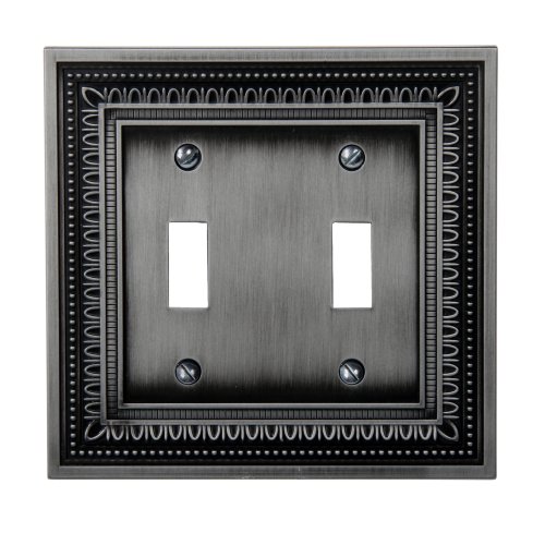 The Amerelle Filigree Border Collection is a lively combination of styles and periods. Its lines, curves and shapes are an ideal complement to an eclectic dcor and look great with deeply saturated colors. This dcor wallplate is made of cast metal and has an antique nickel finish. Matching screws are included. Double toggle configuration. UL approved.Antique nickel cast metal wallplate designed with ornamental lines and curvesIncludes color-matched screwheads for a seamless imageDouble Toggle configuration; also available in Duplex, Rocker/GFCI and ToggleUL approvedMatching decorative hardware available
