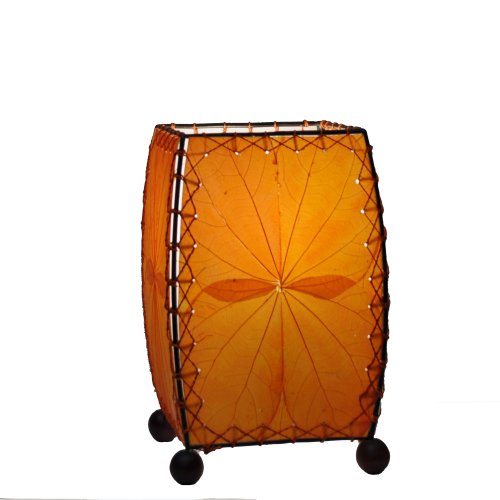 This beautiful fossilized alibangbang leaf lamp made in the Philippines will look great in any decor.The frame is constructed from wrought iron, making the lamp very strong and durable; then it is powder coated in order to ensure the longevity of its color.Alibangbang, known as the butterfly leaf in the native language or illango, is shaped like a butterfly. this leaf has both medicinal and food flavoring purposes throughout the south pacific.Fossilization is the process of drying leaves over a three to four month period and then hand rubbing the chlorophyll of the leaf so only the leafs skeleton remains. this is a labor-intensive process and no corrosive chemicals are used. once the chlorophyll is removed, the leaf is stained in organic dyes.Since the leaves are natural, each one will absorb dye differently. the resulting effect is a lamp with different hues and shades (sometimes within the same leaf).There are a few cases in which the leaf may have a small tear before it was adhered to the lampshade; due to the low-impact sealant we use, no tear will increase in size nor will any leaf pull from the shade. we would like to point out that only 20 percent of the leaves make it through the entire process for use for our shades.Once the leaf is stained, it is adhered to a heat resistant backing; similar to the backing found on any standard lamp. the artists cut each leaf to ensure that no leaf will overlap. finally, we use a strong sealant to ensure the stability and integrity of the shade.Requires 1 light bulb (not included). Compact fluorescent light bulbs are highly recommended. these bulbs will get nice and bright without the added heat of a standard incandescent bulb. These bulbs also last much longer, in many cases over five years.Dimensions: 6 x 6 x 8Due to the handmade quality of our items small variations in dimensions can exist.
