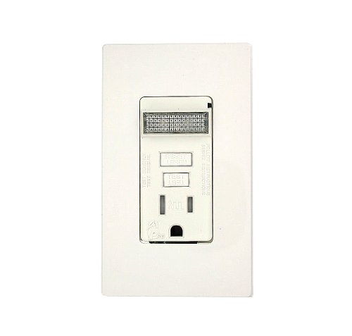 15A-125V , Tamper-Resistant, SmartlockPro Combination GFCI .Single outlet with sensor controlled Guidelight, monochromatic, subplate assembled onto strap, Decora plus screwless wallplate included - White.